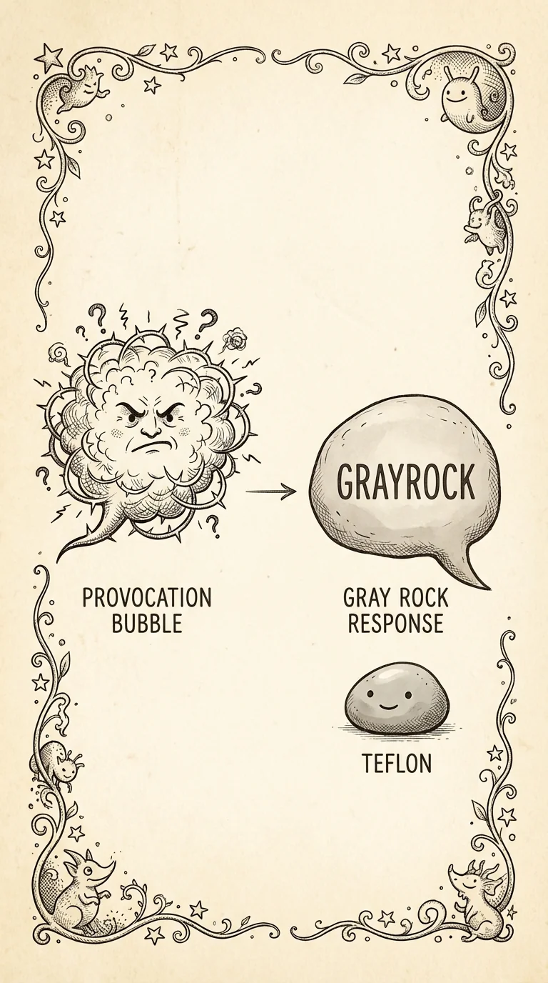 Drama feeds on reaction. Gray Rock means making yourself as uninteresting as possible — no visible emotion, minimal words, nothing to latch onto.