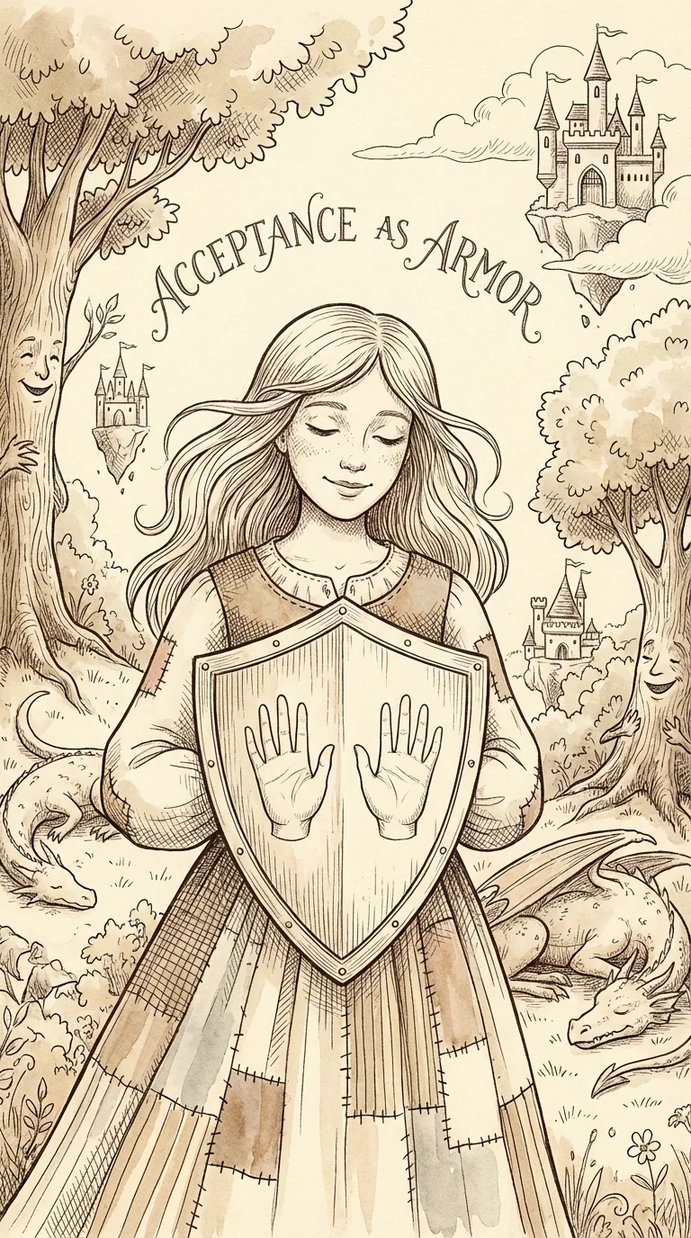 Acceptance isn't giving up. It's freeing yourself. Open palms etched in your shield — strength through release.