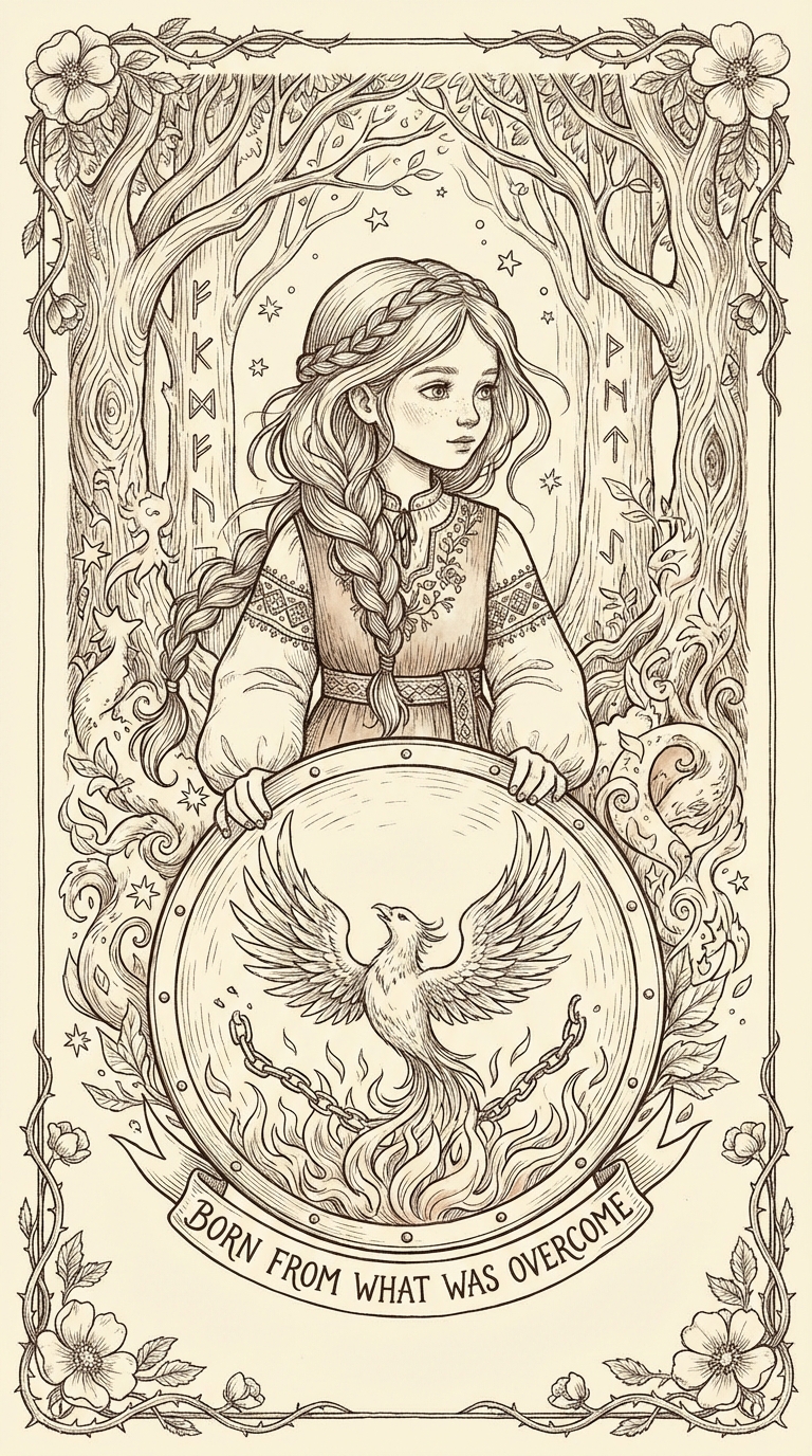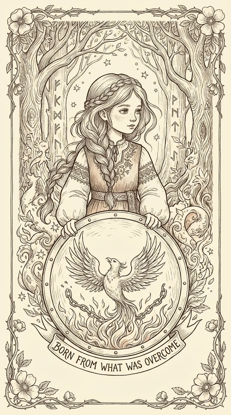 Your struggle has meaning. You found some of it. A phoenix rises from your shield — born from what you survived.